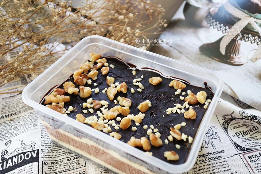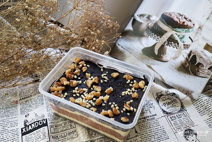表面覆蓋一層濃厚的巧克力,濃香中略帶一絲的巧克力苦甜滋味,相當吸引人,灑上杏仁及核桃果仁,口感香脆飄香,增添滋味及香氣