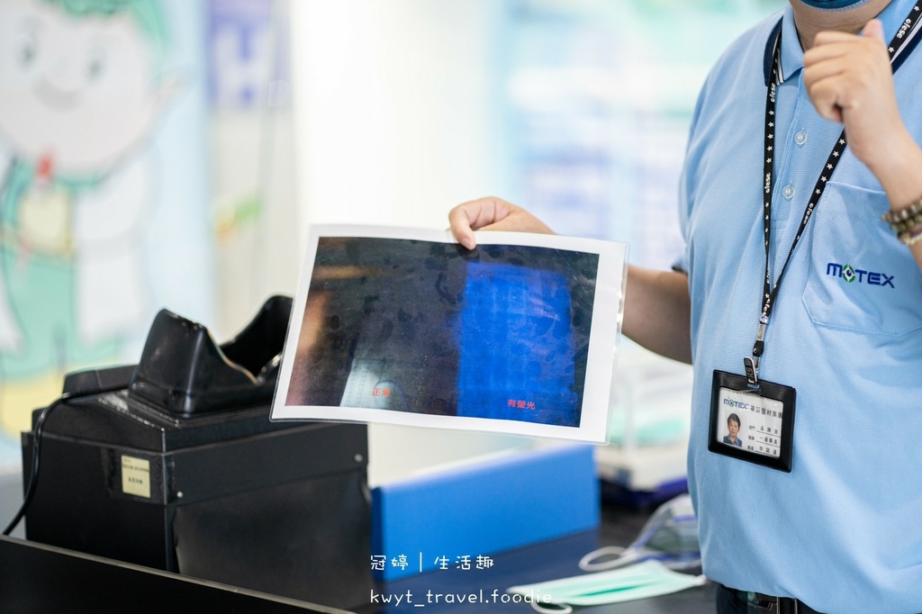 在專業儀器輔助下,了解每一片口罩是否含有螢光劑成分,每一片口罩出廠前都必須經過這關檢驗,無殘留才是可以用得安心及安全的口罩。