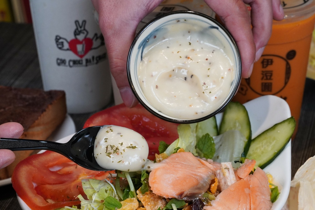 伊浢園早午餐沙拉醬給的很足,所以吃到最後還是可以拌的到沙拉醬,真的很加分~
