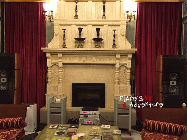 冬天才能使用的暖爐及法國Focal之Utopia頂級音響。桌子上的盒子應該是裝茶包的,但也許是服務人員漏掉了,沒有喝茶的習慣也沒有請服務人員再添補 @@