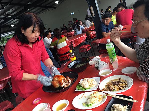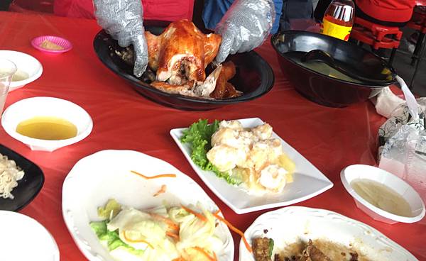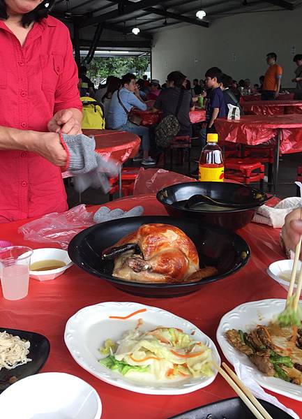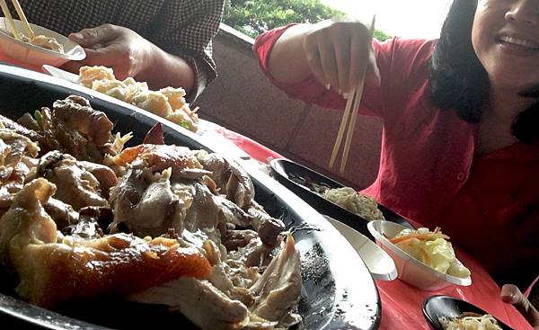 主角出場喇!因為剛出爐很燙口,要戴兩層手套,這皮我馬上撕一片,太·香·脆^^ 後來老闆來到我們桌邊發現脖子我們直接忽略,跟骨頭堆在一起,還告訴我們脖子那邊的雞皮最好吃。
