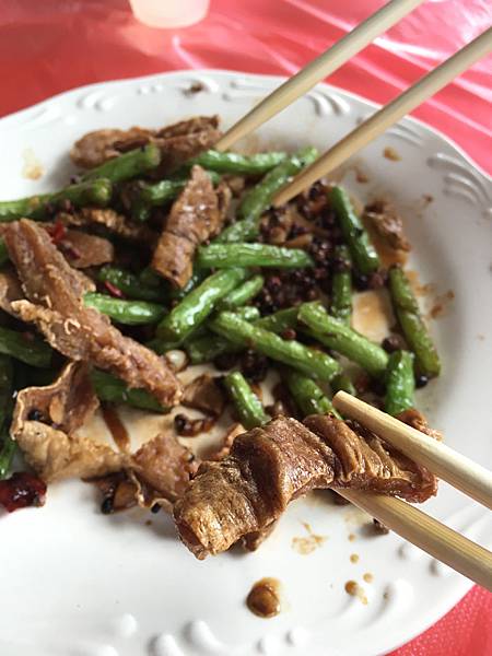 喜歡川味料理的人一定會喜歡這一道 四季豆乾煸香肥腸;肥腸的油脂已經被除去大半,留下韌度和脂肪香,調味有乾辣椒(完全不辣)、茴香川菜常見的,川味濃郁,好吃不油膩。