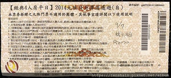 2014年台北國際旅展的時候,正巧看到今埔里渡假大酒店推出「九族日月潭逍遙遊」的商品,經過老婆大人的精算,覺得很划算,所以我們就買了一張住宿券。這張住宿券5498元,內含一晚四人房、九族文化村門票(含日月潭纜車來回票)四張、日月潭湖濱單車1小時租用券4張、活力早餐四客、精緻晚餐四客。九族文化村個人票是850元,4人3400元,日月潭湖濱單車1小時租用券4張價值400元,再加上一泊二食,怎麼算都十分超值啊!