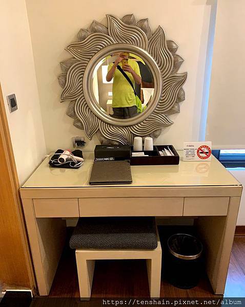太陽形的梳妝鏡,桌上放有衛浴備品。吹風機風量小,而且過熱時會自動斷線,要等冷卻才能續用,建議入住時自備吹風機比較保險。