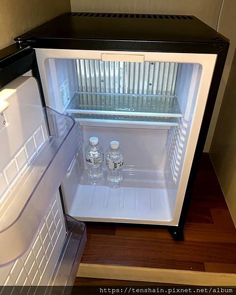 下方櫃門打開,小冰箱中有兩小罐礦泉水,別無他物。
