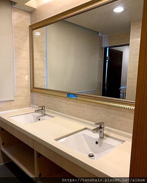 雙洗臉台獨立在浴室之外,不會干擾洗澡或上廁所的人,不錯的設計。洗臉台上有片碩大的明鏡,擦得亮晶晶。