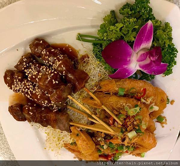 4隻炸蝦和4串豬肉串,炸蝦殼酥脆到可吞下的程度,有奶油味,蝦肉緊實好吃。豬肉串有肥肉,而且料理的方法不是我能接受的範圍,只好請老婆幫忙吃。