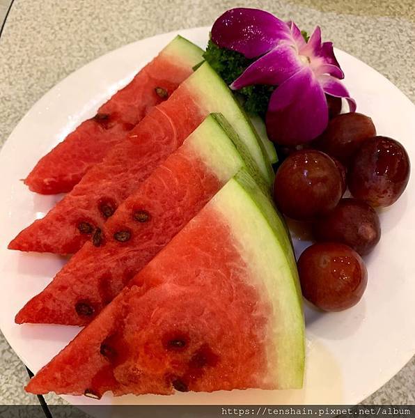 水果是西瓜、葡萄。西瓜因前一陣子中南部大雨不斷,已有水傷,甜度自然不足;葡萄水準不錯,硬脆多汁。