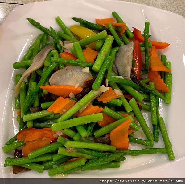 香菇、紅蘿蔔、青椒炒蘆筍,青脆嫩口。