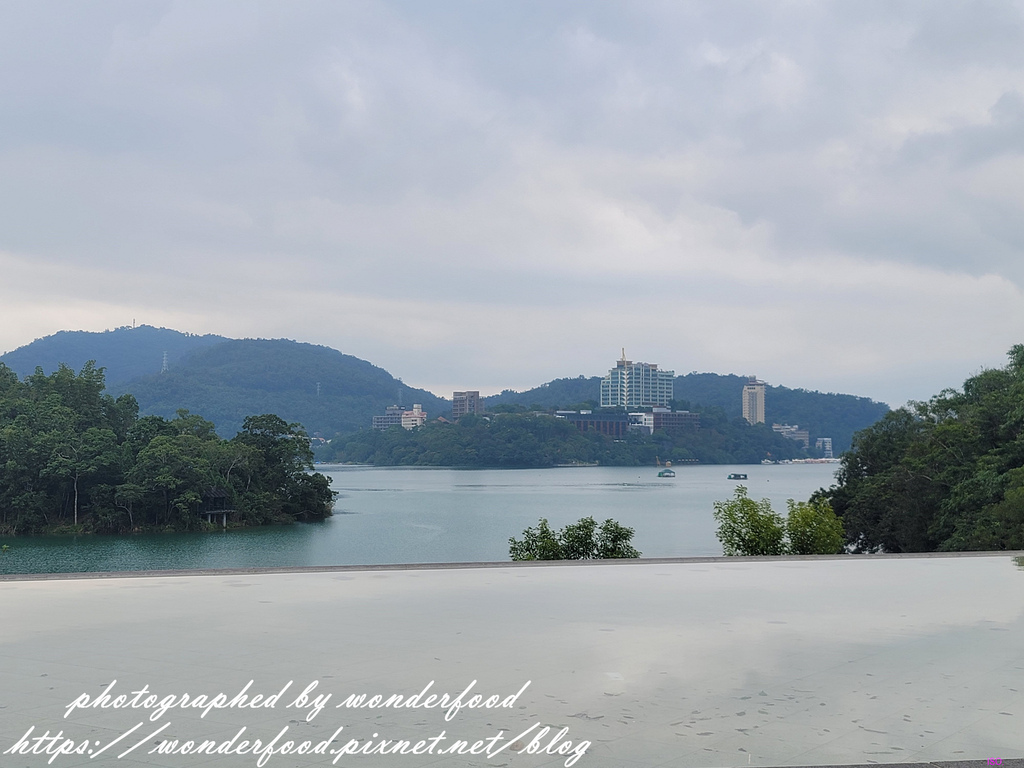 搭配的景色是無邊際水景池、碧綠潭水和遠方的涵碧半島