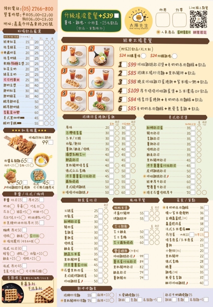 主打高CP值精緻早午餐的太陽先生早午餐,餐點選用的食材皆為闆娘、闆闆共同把關的優質蔬菜、肉品、水果,供應:經典太陽套餐(85元起)、招牌炸蛋捲餅/蛋餅(20元起)、美式起司堡(35元起)、朝時蛋吐司(25元起)、風味早餐(50元起)、茶食/單點(10元起)、熱呼呼麵食(55元起)、私房推薦、果醬/法式/焗烤土司厚片(15元起)等系列餐點;可選擇搭配好喝飲品嚴選的16款飲品一同享用,皆採現點現做,趕時間的朋友,建議可以先打電話預訂。