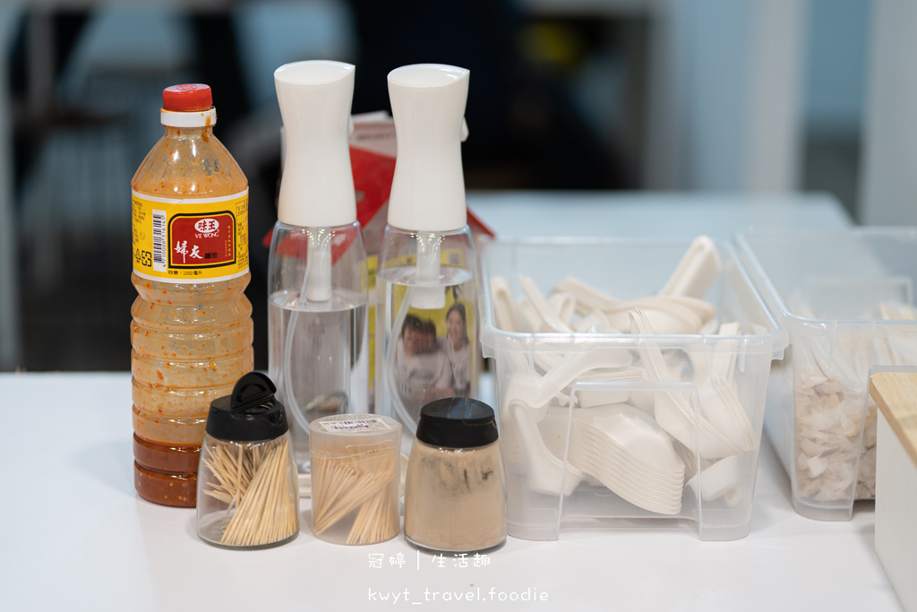 自助區備有:可用於清潔的酒精、辣醬、牙籤、胡椒粉、湯匙、筷子、紙巾,均可自行取用,自助區後方有整潔的洗手間可使用,很~貼心!