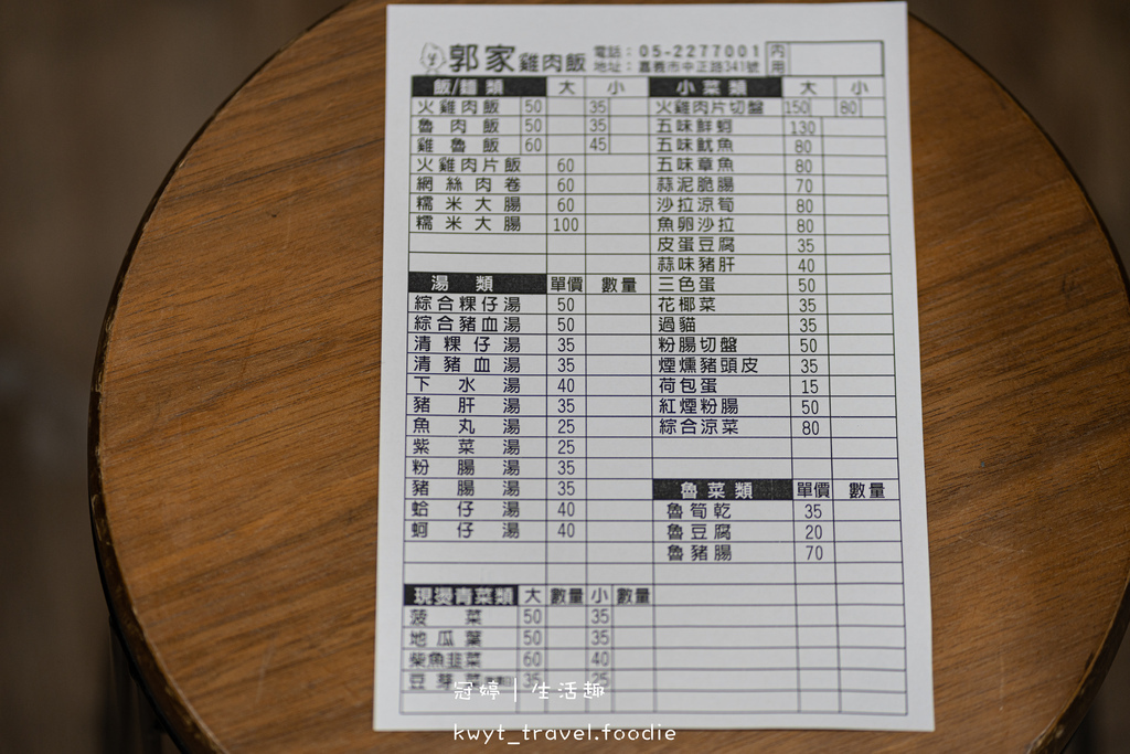 嘉義西區美食小吃推薦-郭家火雞肉飯菜單 (攝於2022.12)