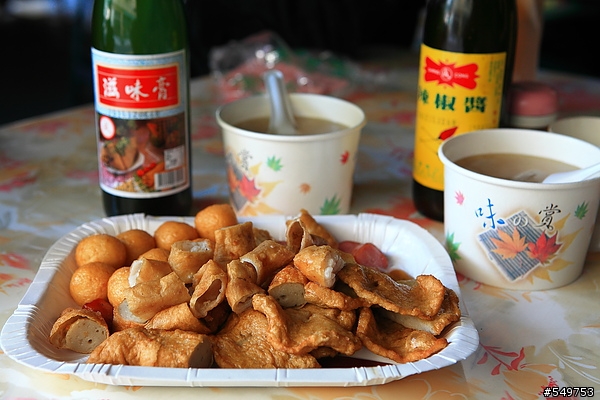 最後點了黑輪、天婦羅、大腸頭、香腸,還有腸仔菜頭湯,湯頭讓人驚奇,除了菜頭外,還加了柴魚,甘甜清香,其實它關東煮大鍋也有一些煮物,不過它是整枝含竹籤下去浸的,個人覺得像現代的用方形鍋,只讓食物的部份煮熟的方式會較好。它的炸物裝在自助餐盤上,火候控制的很好,不同於烤的方法,食物多了股油香味,外皮也很薄脆,桌上放著新化老店,成功醬園的醬油膏及辣椒膏,新化有另一家老店東成醬油,大部份台南店家都會用這兩家的醬油膏,適當的甜度也提升了食物的滋味。