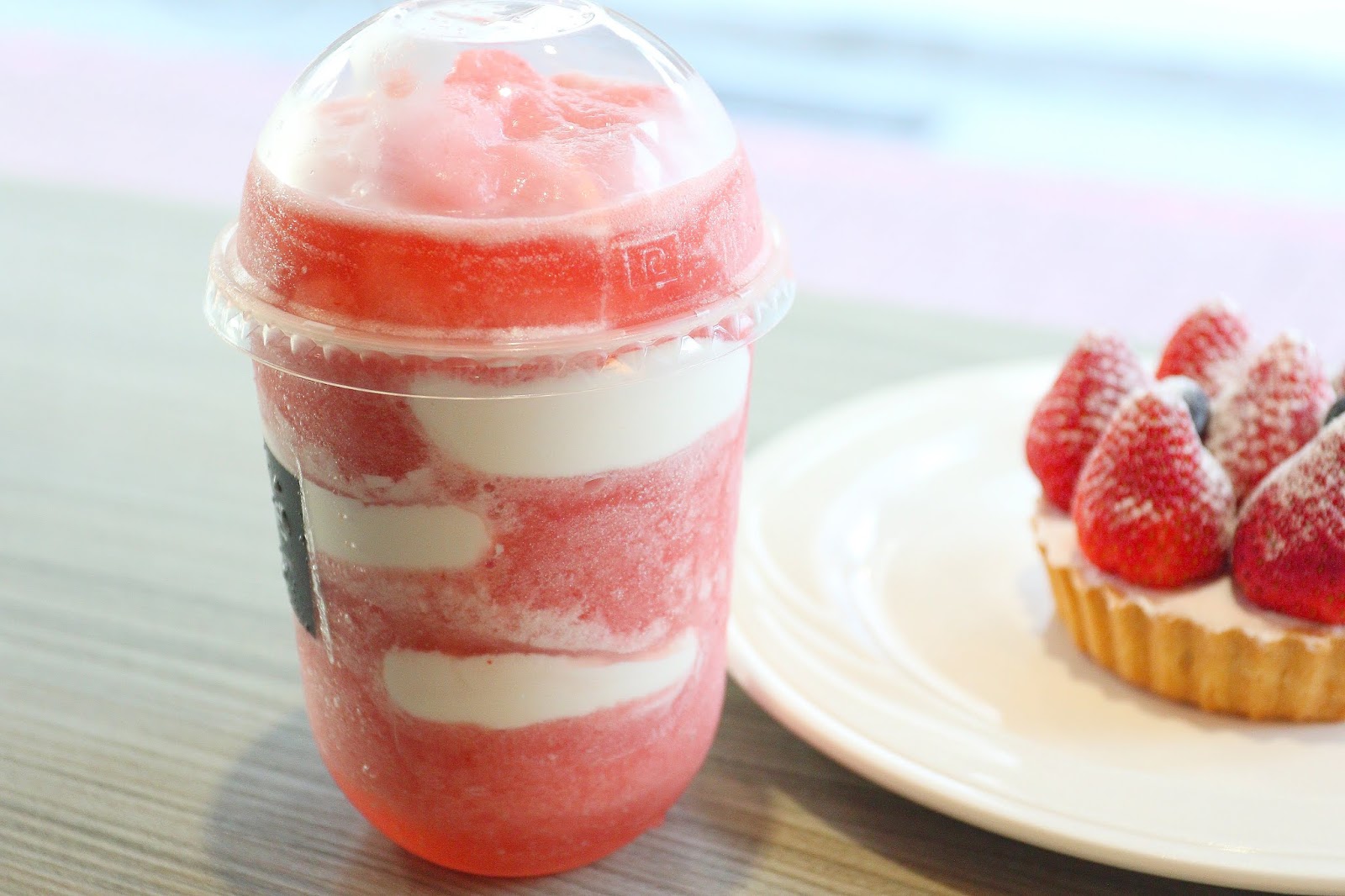 冰沙口感細緻香甜中帶著淡淡草莓滋味,雲朵則以奶油代替,