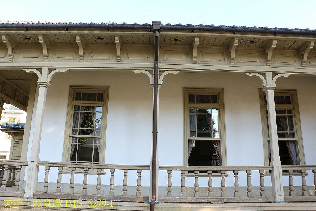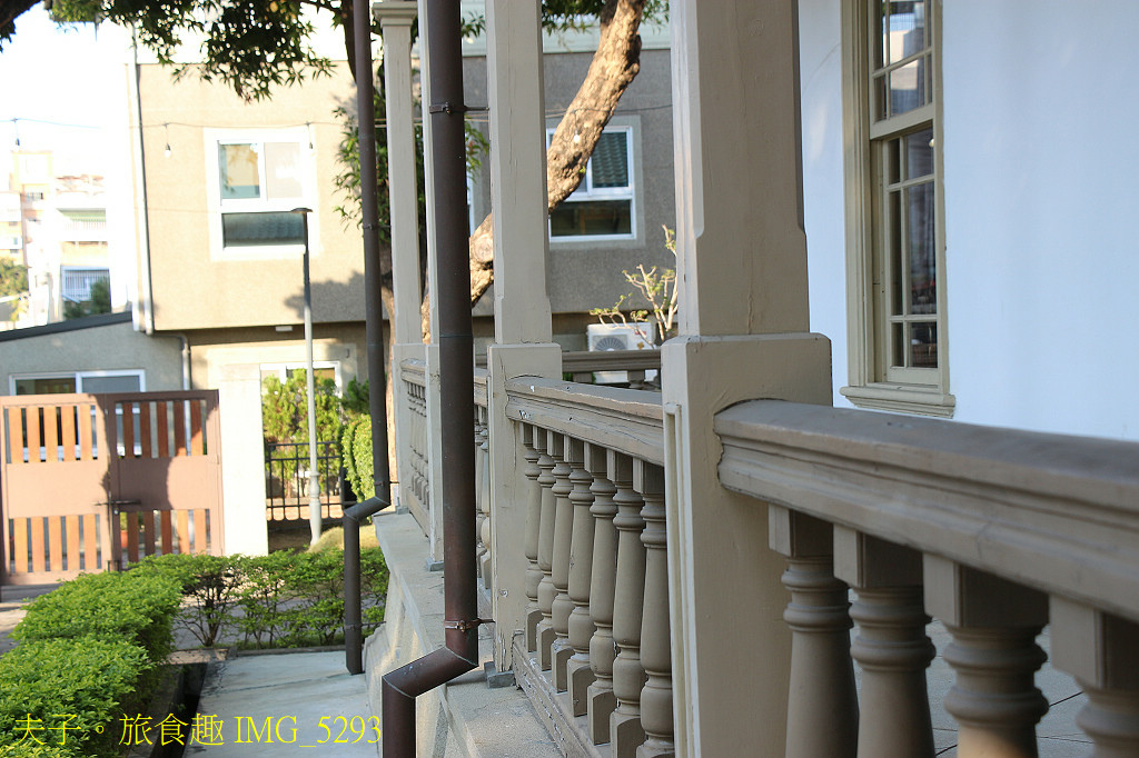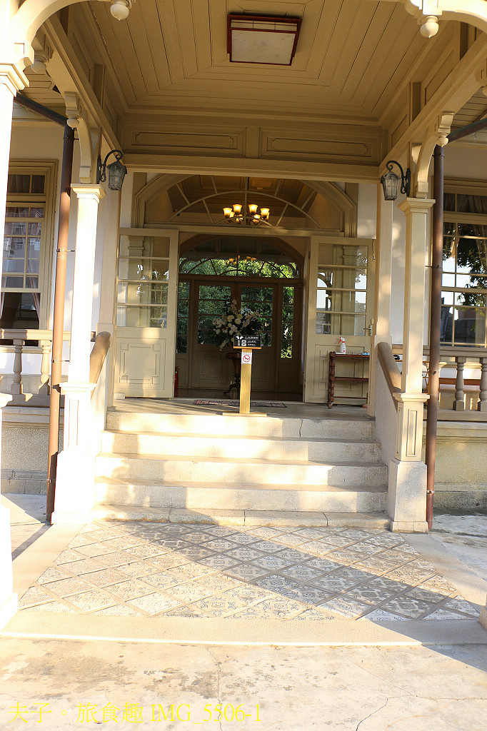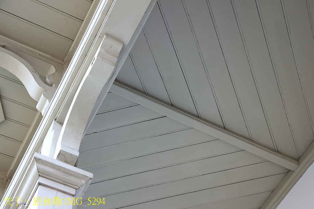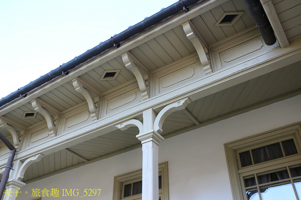 「原台南廳長官邸」洋館建築,牛腿形托架、弧形托架、欄杆,倒吊寶珠飾、西洋柱式、圓弧形欄間、斜向的木摺板天花與牆面等設計手法,頗具特色值得細品觀察。