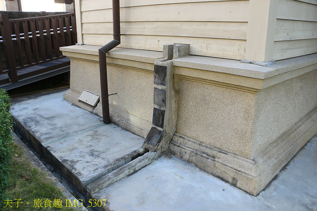 洗石子的台基,設有通風口與鑄鐵柵欄的洩水口。
