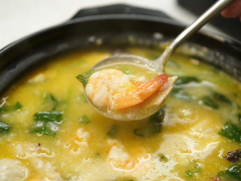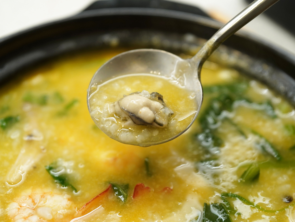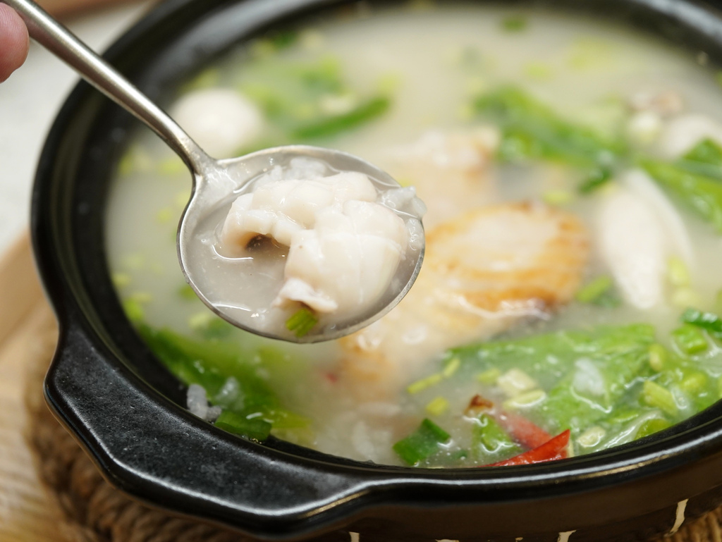 這碗粥的泡菜味道清爽微辣,用的是韓國魚板,而且竟然加了兩種起司(起司絲和乳酪片),越吃越濃郁,味道很有層次。特別要提的是「小鮮肉」,據說是豬肉裡比老鼠肉還稀有的部位,肉質非常好,久煮不爛,口感軟嫩又不柴,沒有筋,非常適合家裡的小朋友和長輩。