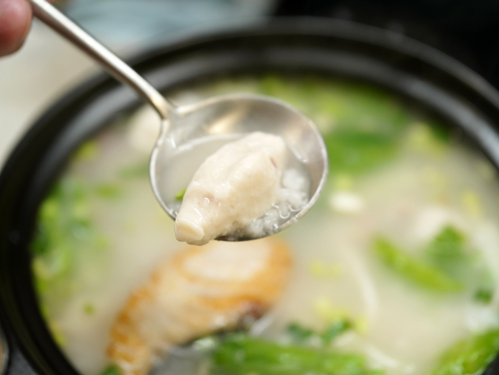 對這碗粥印象深刻,因為用的是來自澎湖的整塊土魠魚乾煎,不像一般店家切得碎碎的。土魠魚本身沒有過多調味,魚肉細緻,完全靠著粥底的鮮甜湯頭來提味,粥體慢火煨煮,不是泡飯那種,米粒吸飽了海味!