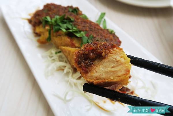 有些素食料理,會把豆包或乾腐皮做成素雞等樣式,這款泰式椒麻G就是運用此概念。在素肉上鋪滿麻麻辣辣的椒麻醬,咬一口富有嚼勁的素雞,真是夠味。
