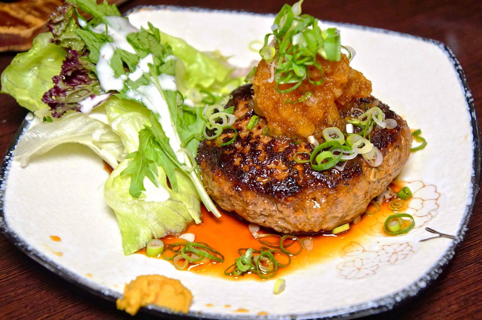 自家製作漢堡排,外皮煎得有點焦,上頭放了一坨醬汁白蘿蔔泥,隨餐有附了生菜沙拉