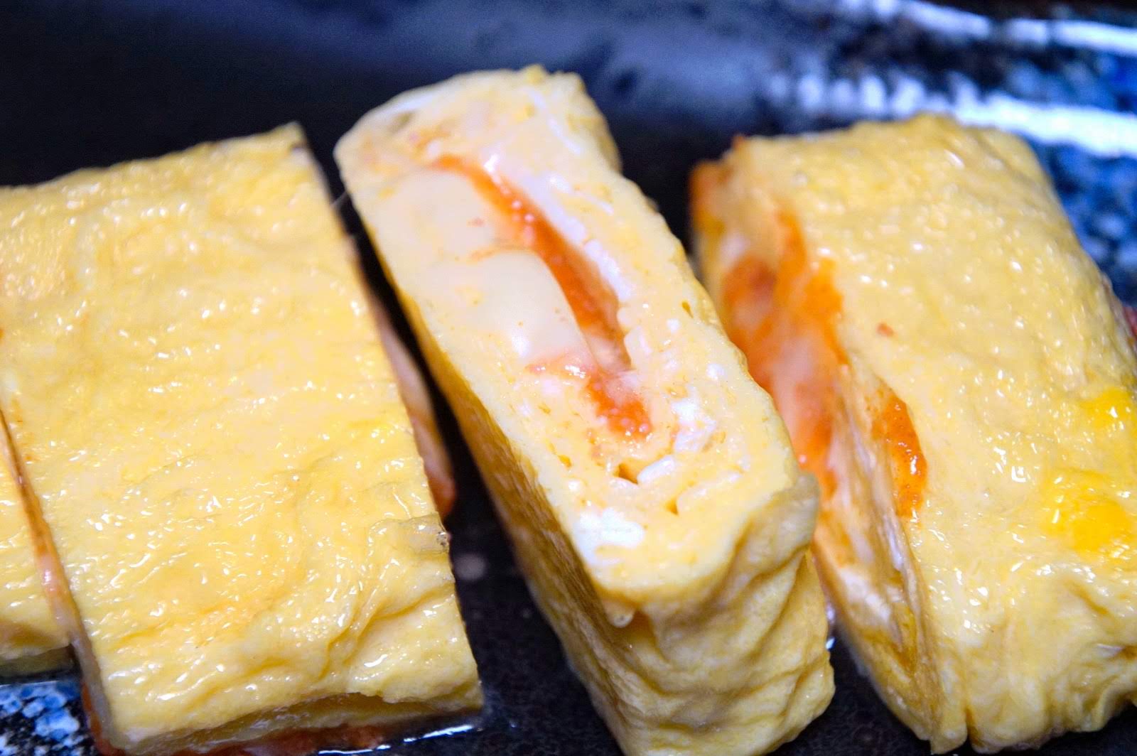 吃起來也是跟玉子燒一樣是帶著甜甜的味道,中間包裹著大量的起司與明太子