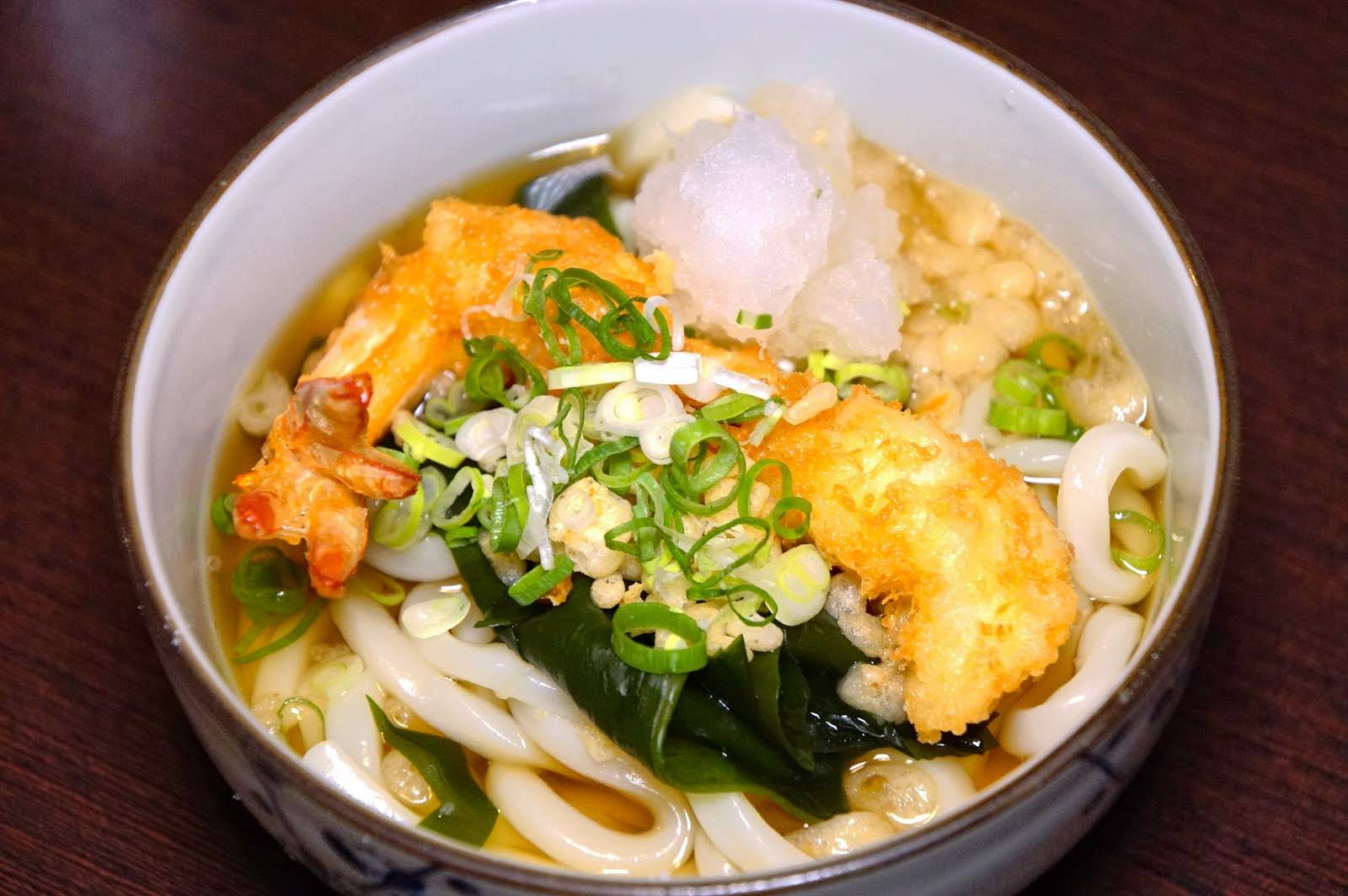 炸蝦烏龍麵,柴魚湯底的烏龍湯麵,主菜是兩隻炸蝦
