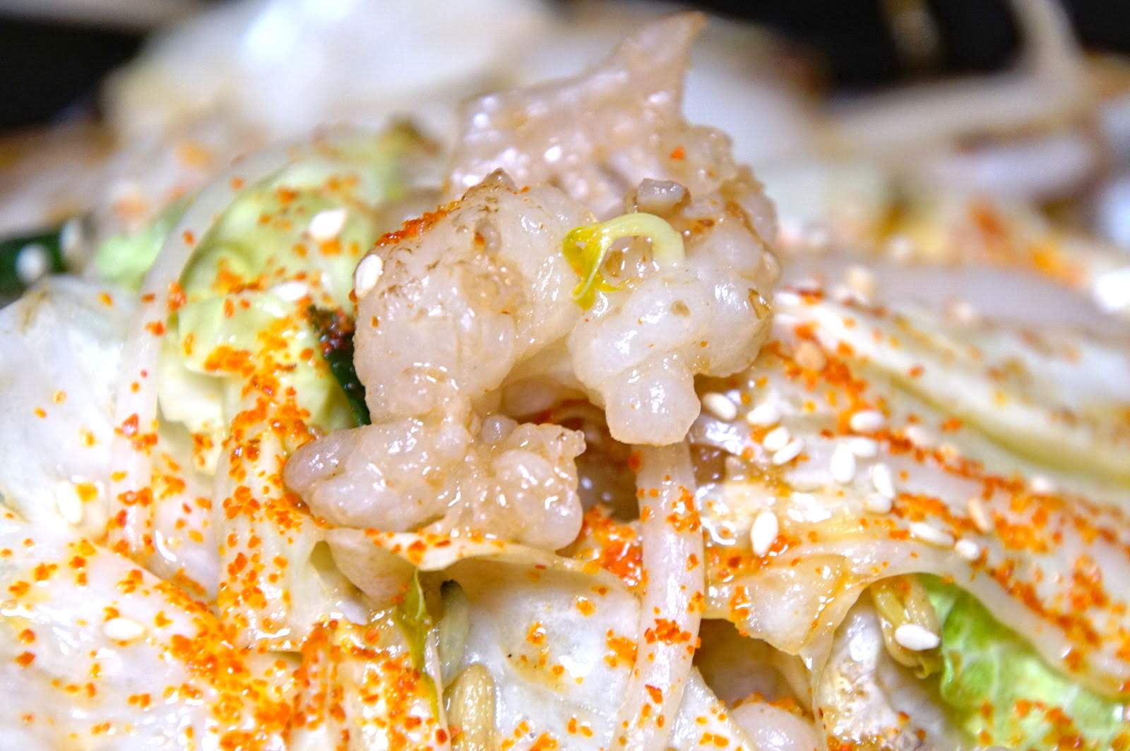 醬燒和牛牛腸,以小鐵鍋製作的燒物,放了大量的高麗菜