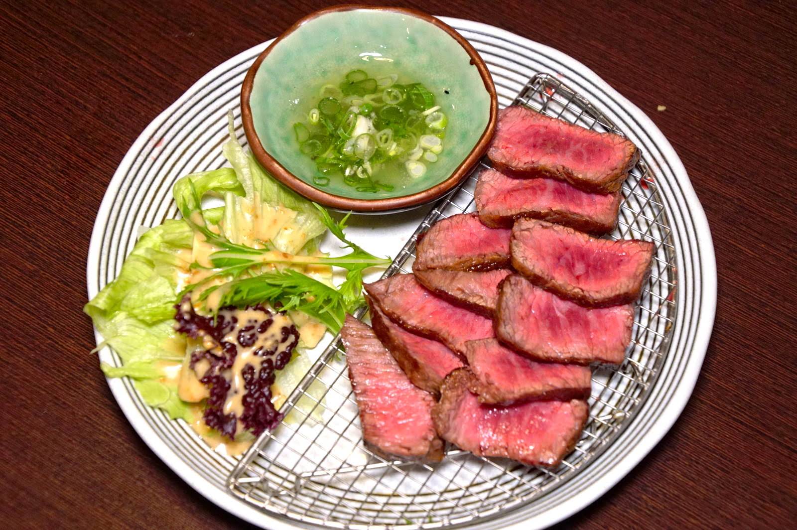 和牛牛排,當天最貴的餐點,牛排煎至約3~5分熟,吃起來軟嫩中帶著一些嚼勁