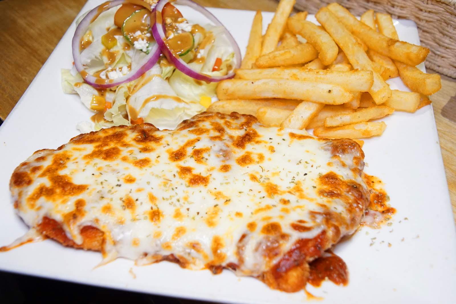 帕馬森起司炸雞排 NT. 320,以炸過的雞胸肉片林上特製的紅醬,再放上帕瑪森起司來焗烤,上桌時雞排上有一層濃郁的起司覆蓋,附餐為沙拉以及薯條