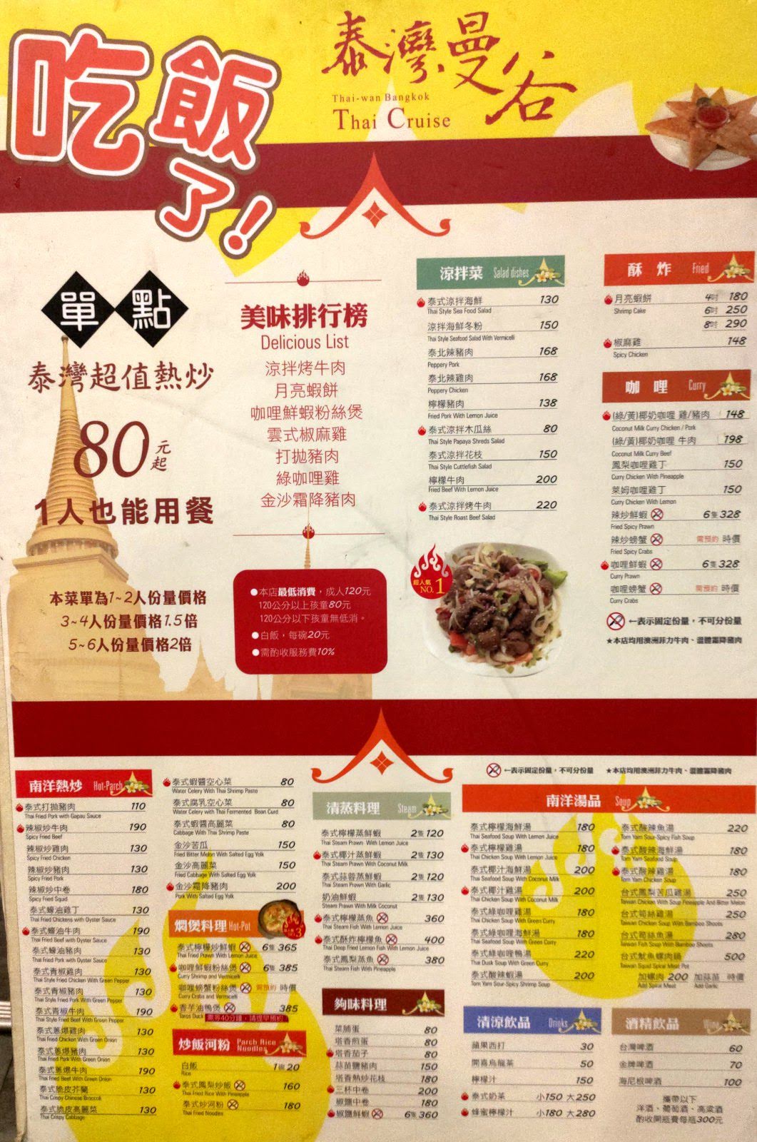 菜單,這是單點的部分,主要分為熱炒、燜煲、炒飯河粉、清蒸、夠味料理、南洋湯品、涼拌、酥炸以及咖哩。而我們今天點的是12人套餐-含湯品共11道菜 NT. 4200(套餐有2人、3人、4人、6人、8人、10人與12人),本來以為泰灣曼谷FB有菜單就沒拍了,但後來發現.... FB上的套餐菜單超小張.... 之後以文字敘述囉~