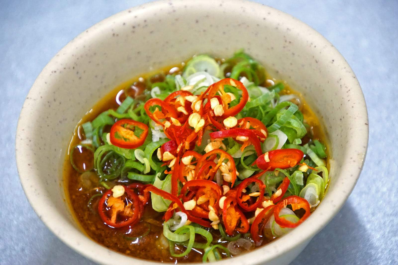 蔥辣蒜 NT. 10/桌,這裡指得是青蔥、辣椒與蒜頭,想要這些配料必須付 NT. 10元,但一桌只要付一次,就可以無限點用。這樣的模式雖然不常見,但也可以讓自行取用配料的髒亂感覺消失。