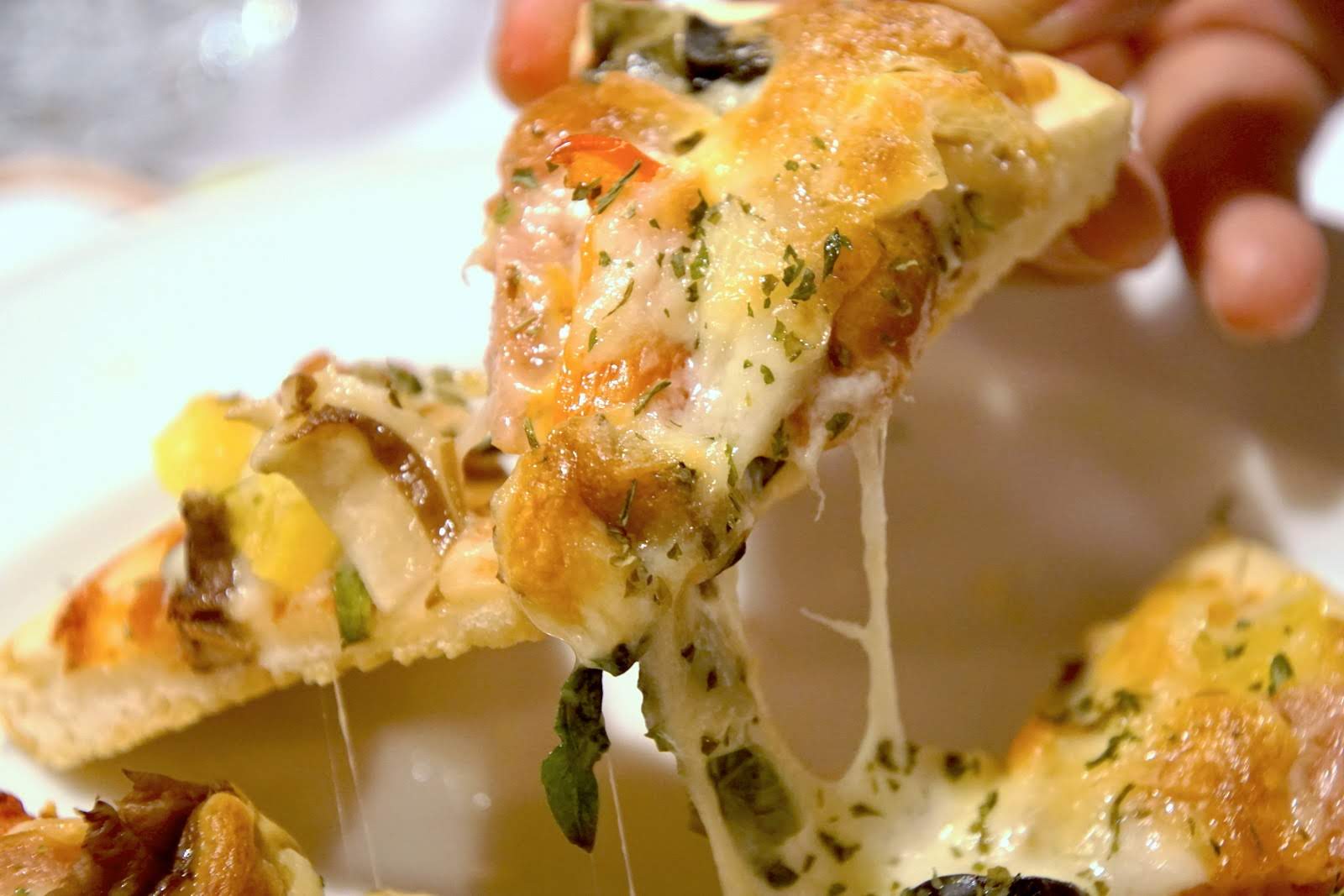 這個披薩雖小,但製作可不馬虎,除了上述的材料之外,還夾了九層塔在其中,而且拉絲也難不倒它