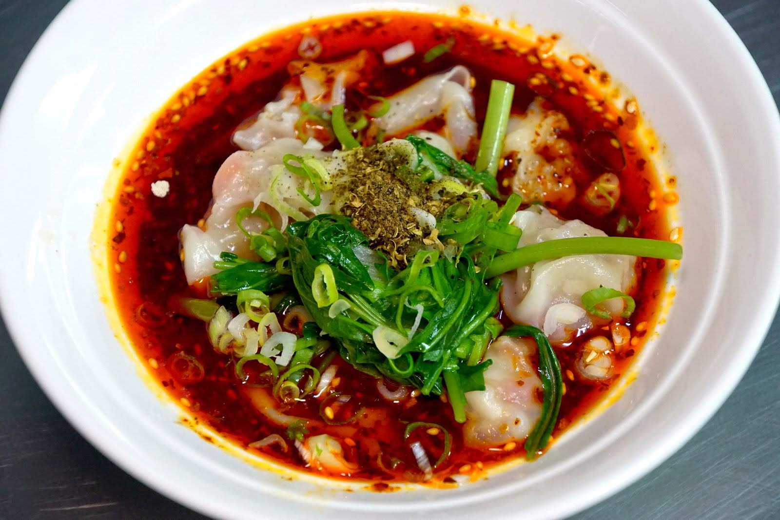 紅油炒手 NT. 50,四川話中的餛飩叫抄手,而紅油抄手就是淋上了辣油的餛飩。上桌時除了辣油之外,還有青花椒粉、青蔥等配料。吃之前可以先拌一下