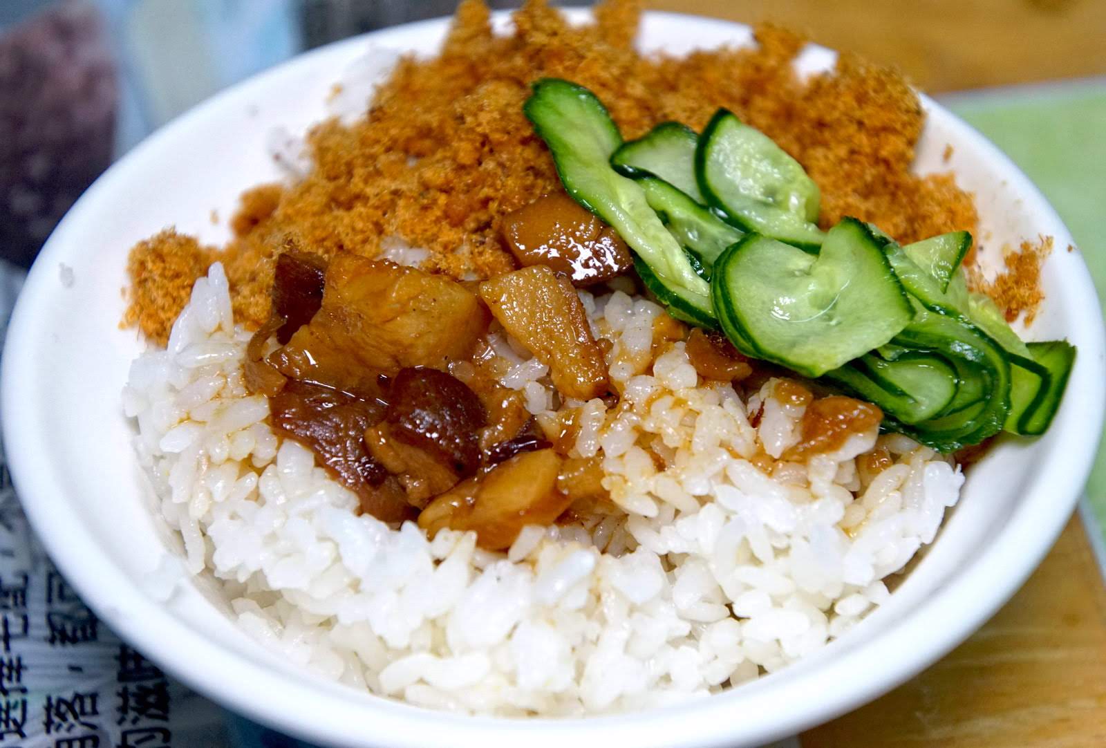 肉燥飯 NT. 20,在白飯上淋了肉燥後,再放上魚鬆與小黃瓜。肉燥以肥肉為主,滷汁用了上等豬肉,加入了紅蔥、蒜、糖、醬油拌炒,在放入老滷鍋中續煮幾天而成。不過,飯的部分比較濕潤,吃起來似乎少了一種感覺,除非有特殊需求,強烈建議點米糕