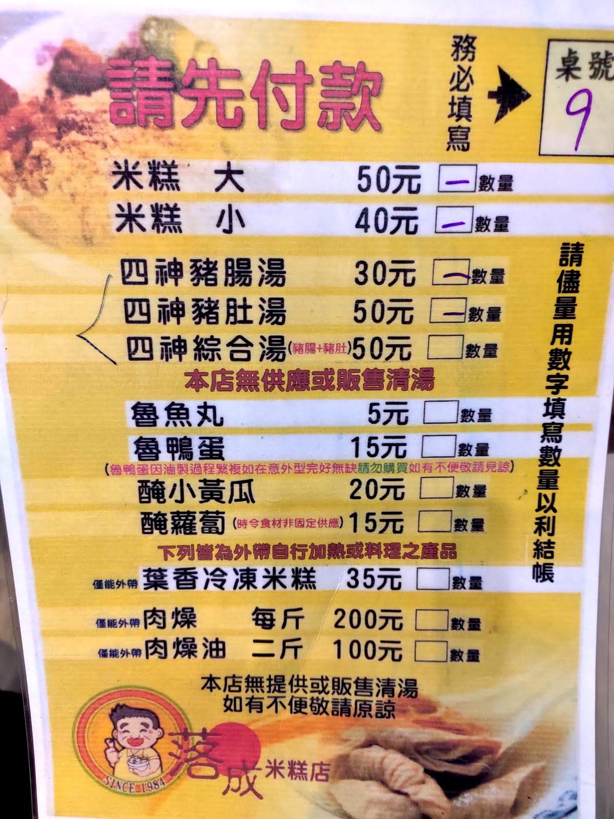 菜單,有米糕、四神湯(豬腸、豬肚與綜合)、滷魚丸、滷鴨蛋以及小黃瓜、醃蘿蔔等項目。但是當年起家的活魷魚已經不見蹤影,大概是因為價錢過高的緣故吧?