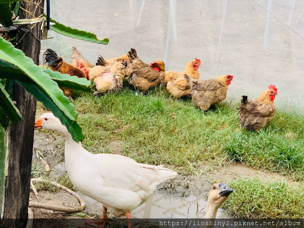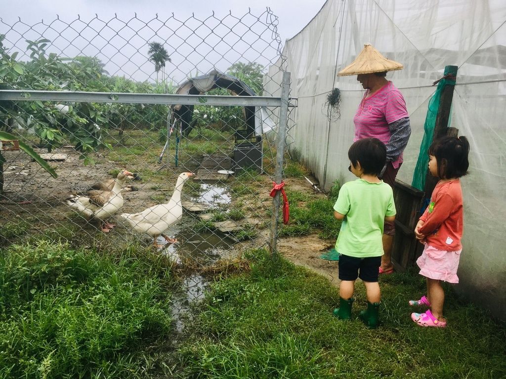 另外阿嬤菜園裡,還有近距離的“濕背秀”-母雞孵蛋。小朋友在這邊可以看到母雞下蛋,鵝散步田埂間。