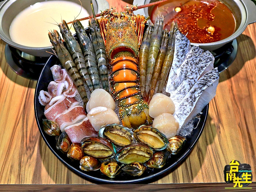 龍蝦享饗海鮮拼盤:食材有龍蝦、帶殼鮑魚、干貝、蛤蜊、花枝、大鮮蝦、海草蝦、鱸魚,每一樣都吃得到新鮮度