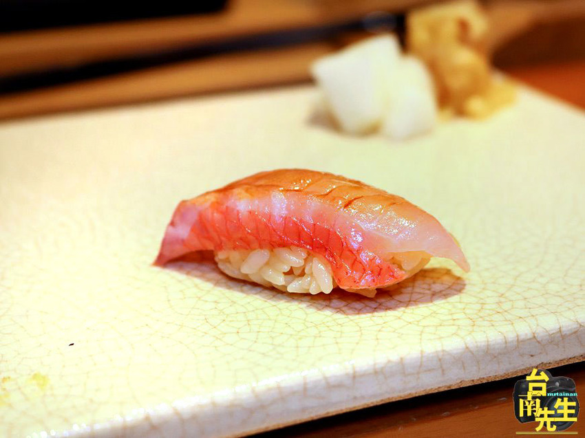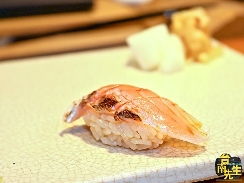 靜岡產金目鯛:老闆笑說這道是自開店以來被許多老顧客說「絕對不能停」的菜色,屬於深海魚,含有豐富膠質,肉質鮮甜肥美、香氣濃郁,算是一年四季口感與香氣都在水準之上的食材,因此才能穩定供應