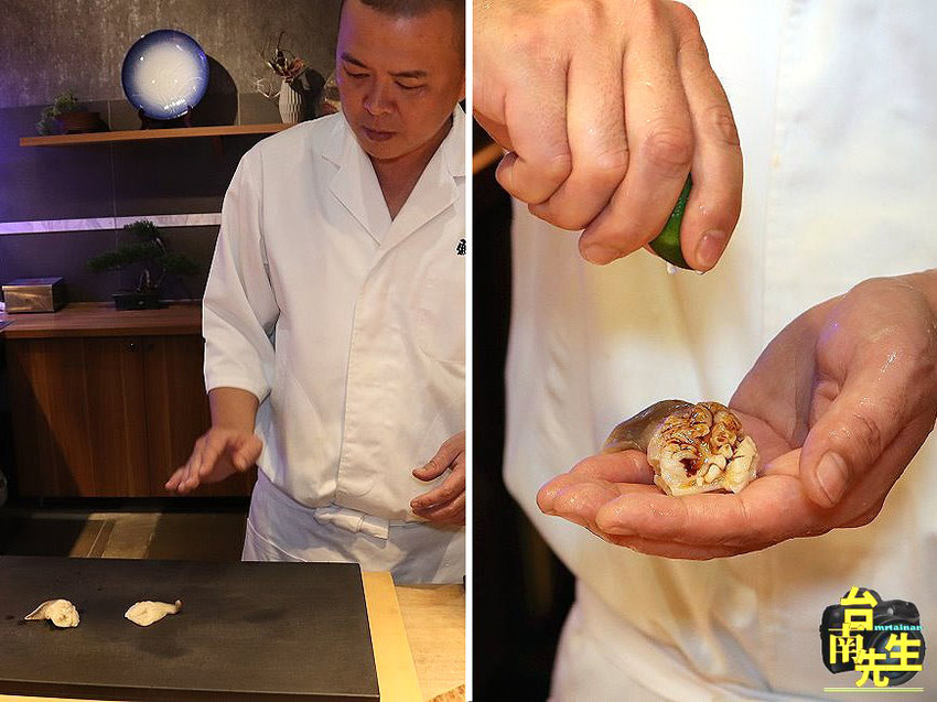 富山灣白蝦:體色透明,略帶點粉色,生長在寒暖流交匯的富山灣300至600公尺水深中,被稱為「富山灣寶石」,表面灑上些許沖繩雪鹽,再擠上幾滴德島酸橘,入口帶有天然甘甜味與細緻嫩滑的口感