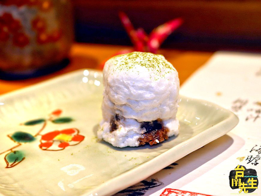 相思吹雪:將煮好的紅豆泥靜置冷藏一晚,出餐時將蛋白、醋、糖等食材打發後蓋在紅豆泥上,稍微蒸過後再灑上些許抹茶粉,蓬鬆輕盈不甜膩