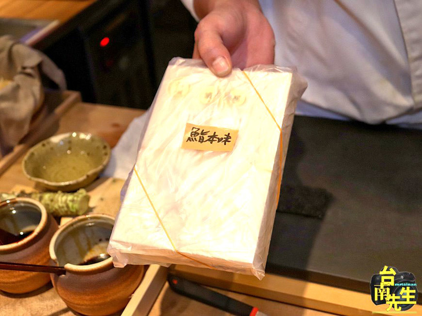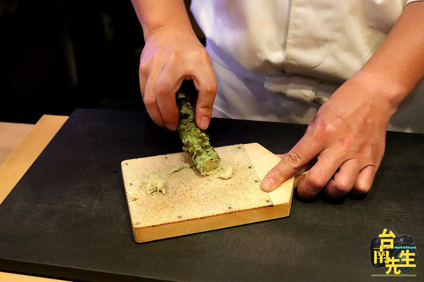 接著準備進入握壽司菜色,老闆先拿出一公斤成本將近1萬元的「伊豆天成產真棲山葵」開始現磨,這種山葵產量稀少,屬於日本米其林店專用食材,入口瞬間嗆辣度極高,然而尾韻卻會回甘,搭配使用鯊魚皮磨泥器,磨出來的山葵更加細緻綿密且粘稠