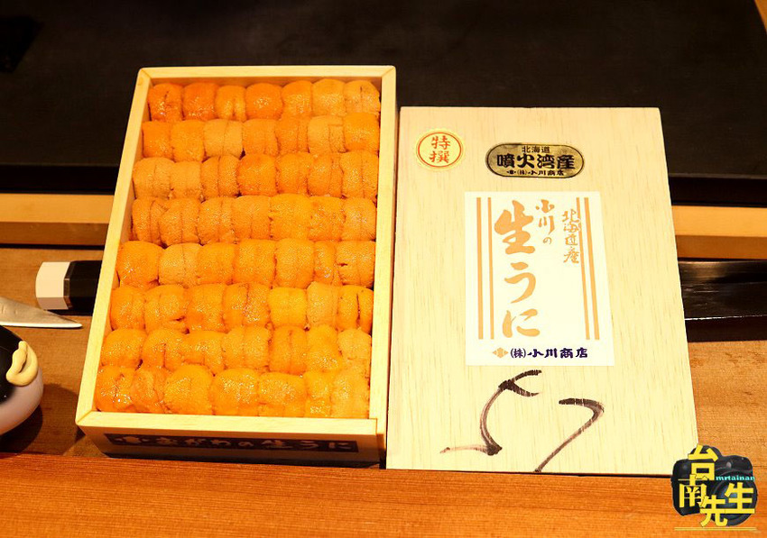 噴火灣海膽:光看日本廠商直接在外包裝貼上店名,指名要留給鮨本味,就知道老闆叫貨實力不簡單,有些頂級食材可不是有錢你想買就能買得到