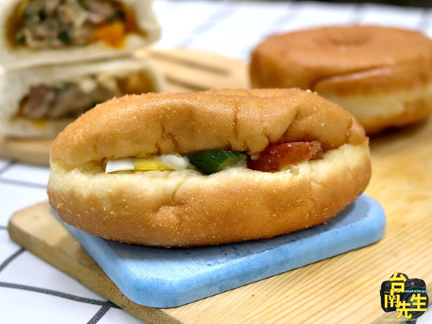 沙拉包:麵包體紮實有嚼勁,內餡夾入切片水煮蛋、小黃瓜、香腸,再搭配少許美乃滋,鹹甜交融越吃越開胃