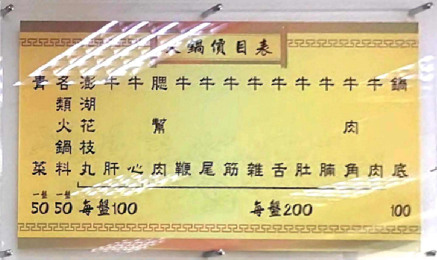 牛肉火鍋的菜單在側面的牆壁上,有牛肉、牛角肉、牛腩、牛肚、牛舌、牛雜、牛筋、牛尾、牛鞭、腮幫肉、牛心、牛肝等,幾乎可以把整頭牛從頭吃到尾了!