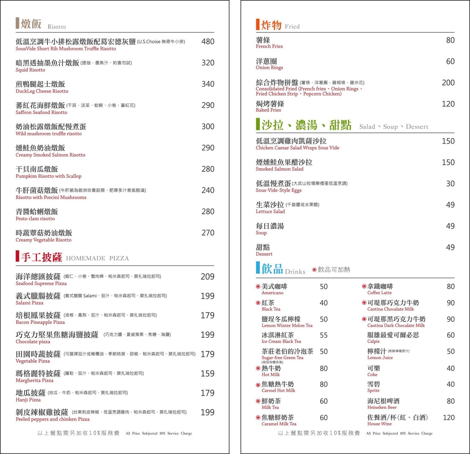 菜單,第二區為燉飯、手工披薩、炸物、沙拉、濃湯、甜點以及飲料。其實還有第三張菜單,但因為是紅酒,所以請大家到官方粉絲頁看囉