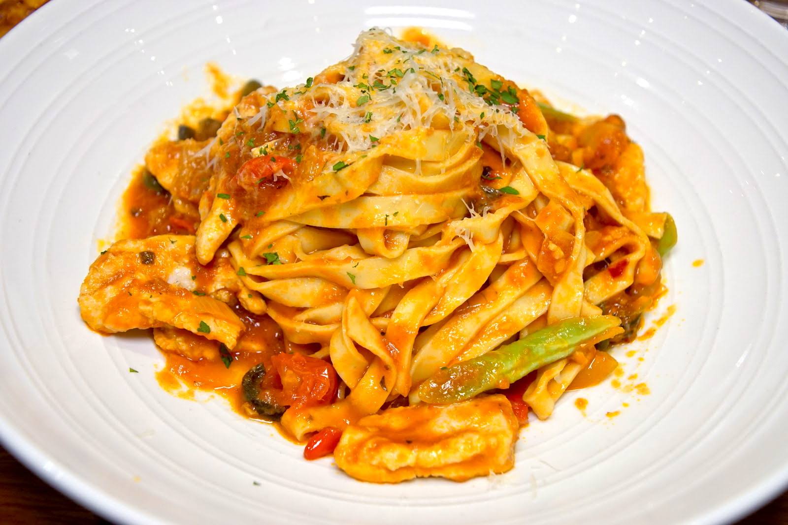 麵條的部分使用了寬麵,讓醬汁更能被吸住;醬汁是紅醬底,除了原始的酸豆、番茄與橄欖之外,還加了鮪魚和鯷魚。