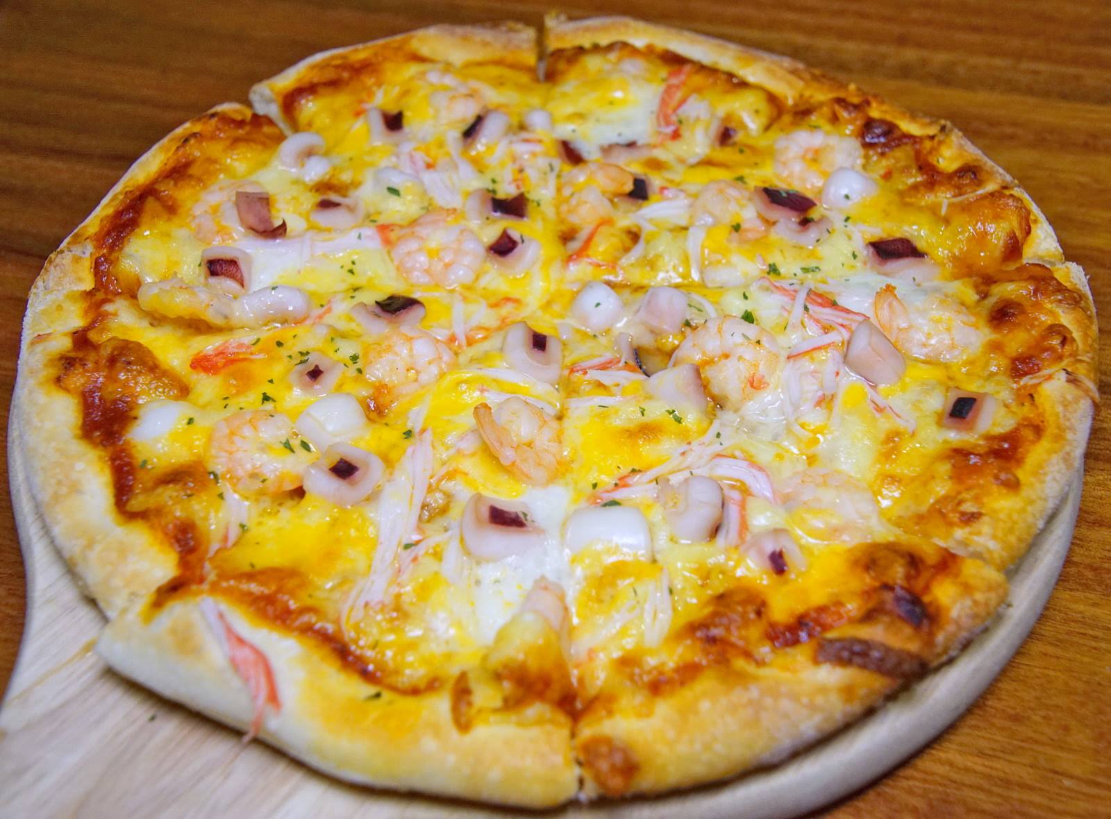 不過,因為配料給得很大方,蝦仁、小卷、蟹肉棒在餅皮上鋪得滿滿,算是吃起來很豐富的一道披薩餐點