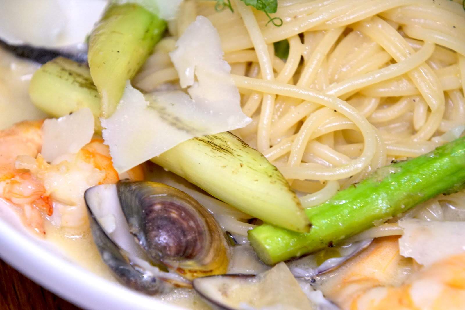 烤蘆筍鮮蝦蘆筍醬/直麵 NT. 370,運用了將軍產的大蘆筍為主菜,再搭配了去殼大蝦、蛤蜊與起司片