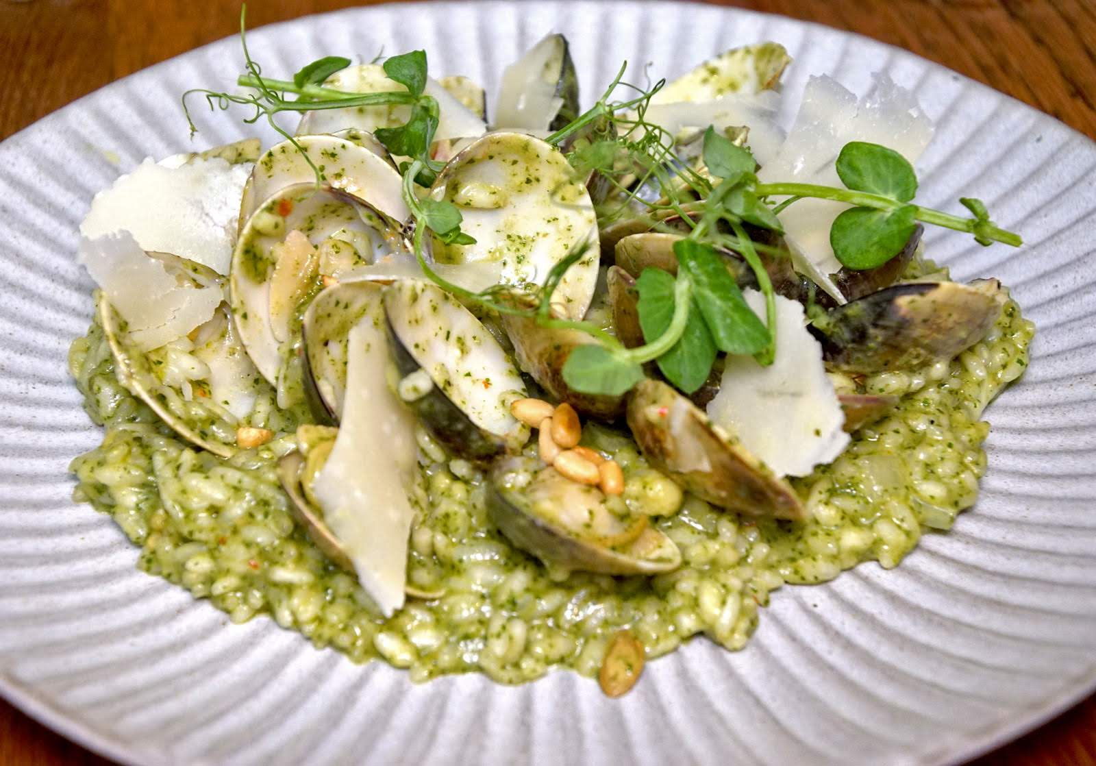 蚌殼精青醬奶油燉飯 NT. 350,用了很多蛤蜊入菜的燉飯料理,青醬不是濃郁路線,吃起來的味道比較淡